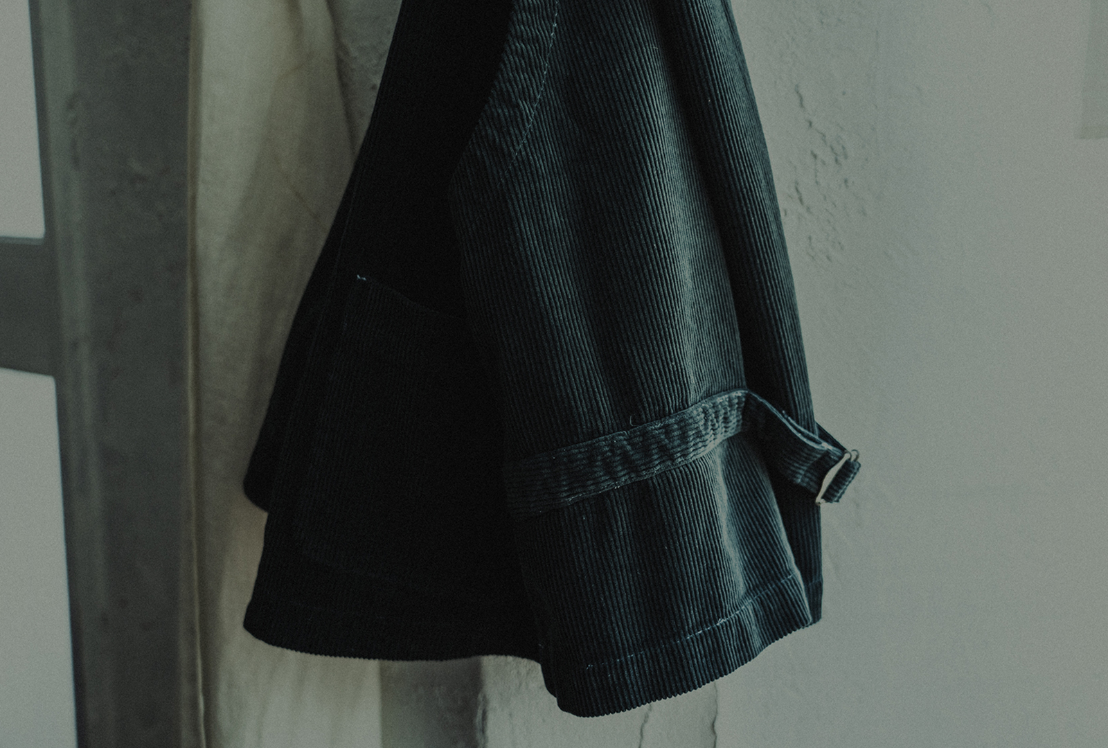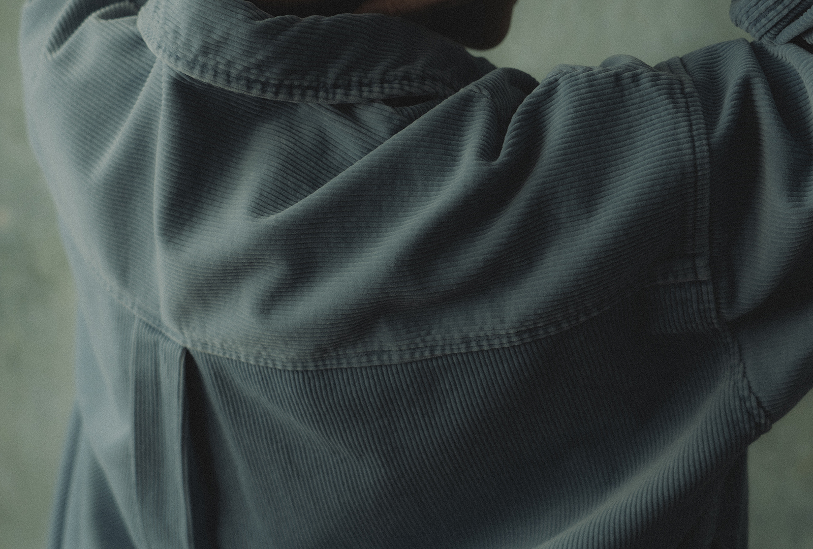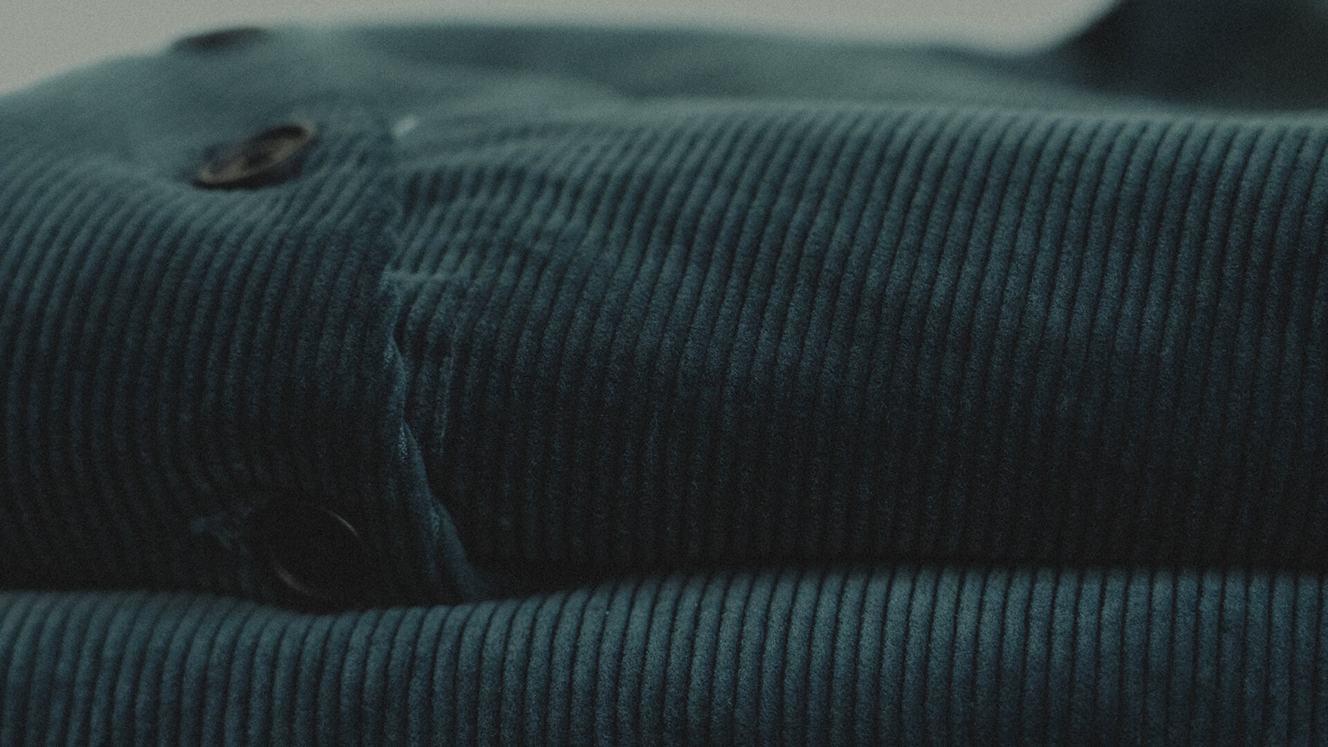 コーデュロイは、綿の平織りや綾織りの生地を基に、パイルを立てて畝を形成する、古くからワークウェアやユニフォームに用いられたきた素材です。畝の太さや密度、カットの深さによって、風合いや表情が変わるため、織機の調整から裁断、仕上げに至るまで、すべての工程に繊細な管理が求められます。光を受けると、畝が生み出す陰影のコントラストが際立ち、淡い艶と奥行きが浮かび上がるの魅力の一つです。