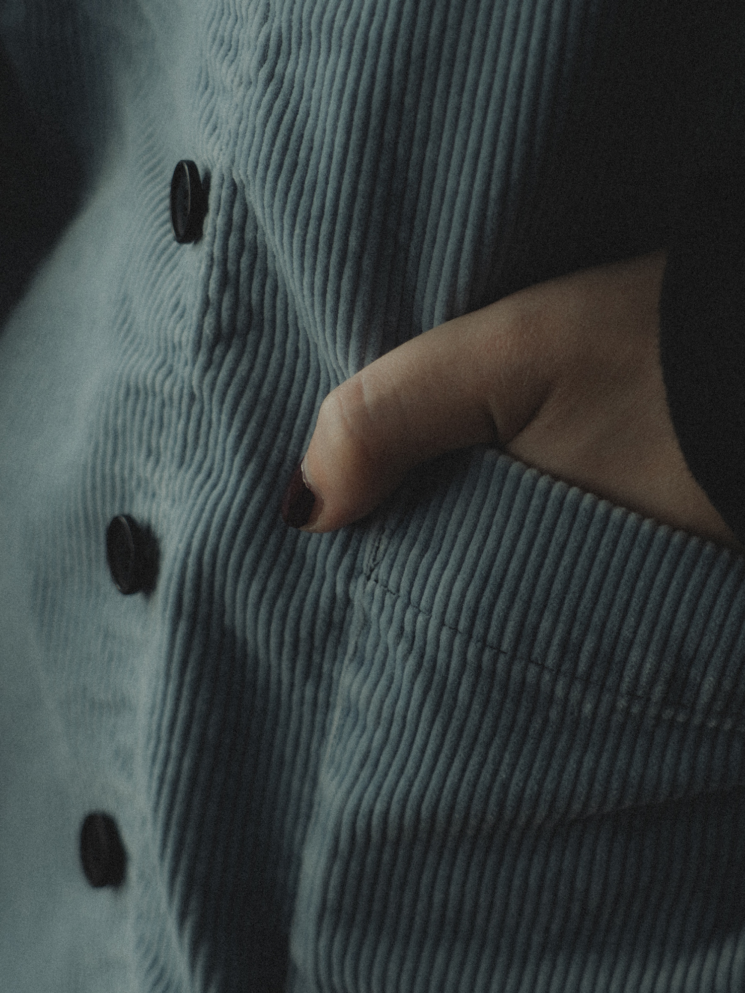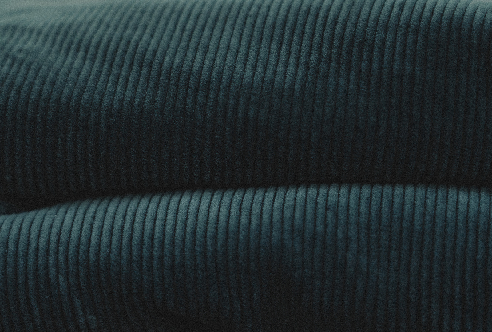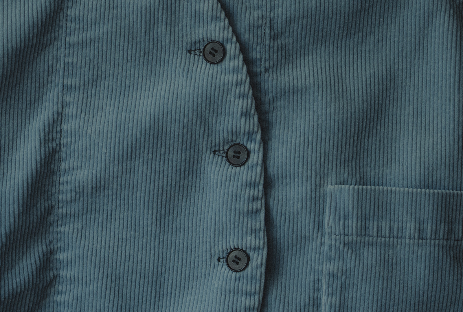 コーデュロイは、綿の平織りや綾織りの生地を基に、パイルを立てて畝を形成する、古くからワークウェアやユニフォームに用いられたきた素材です。畝の太さや密度、カットの深さによって、風合いや表情が変わるため、織機の調整から裁断、仕上げに至るまで、すべての工程に繊細な管理が求められます。光を受けると、畝が生み出す陰影のコントラストが際立ち、淡い艶と奥行きが浮かび上がるの魅力の一つです。