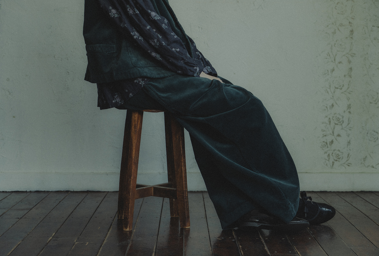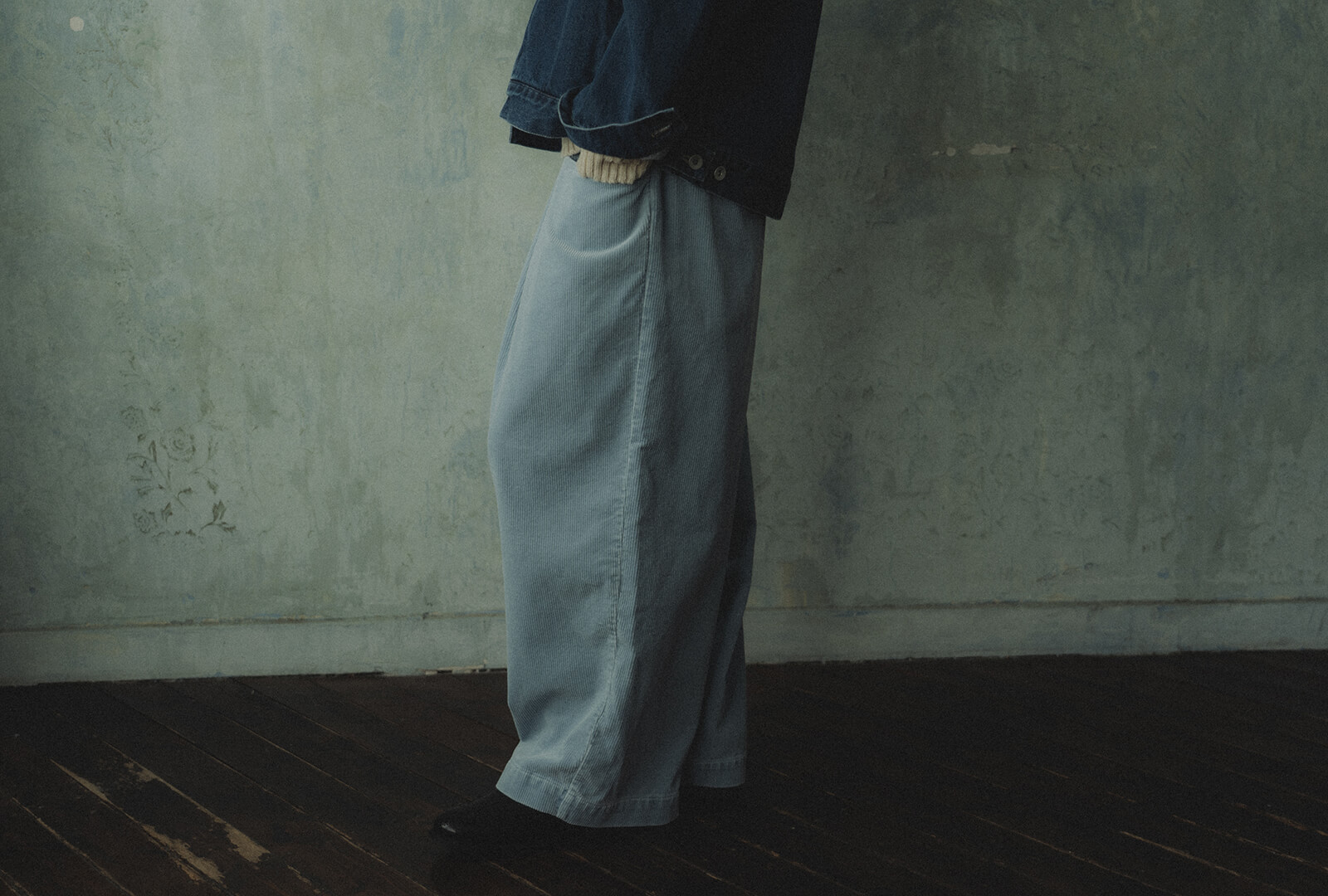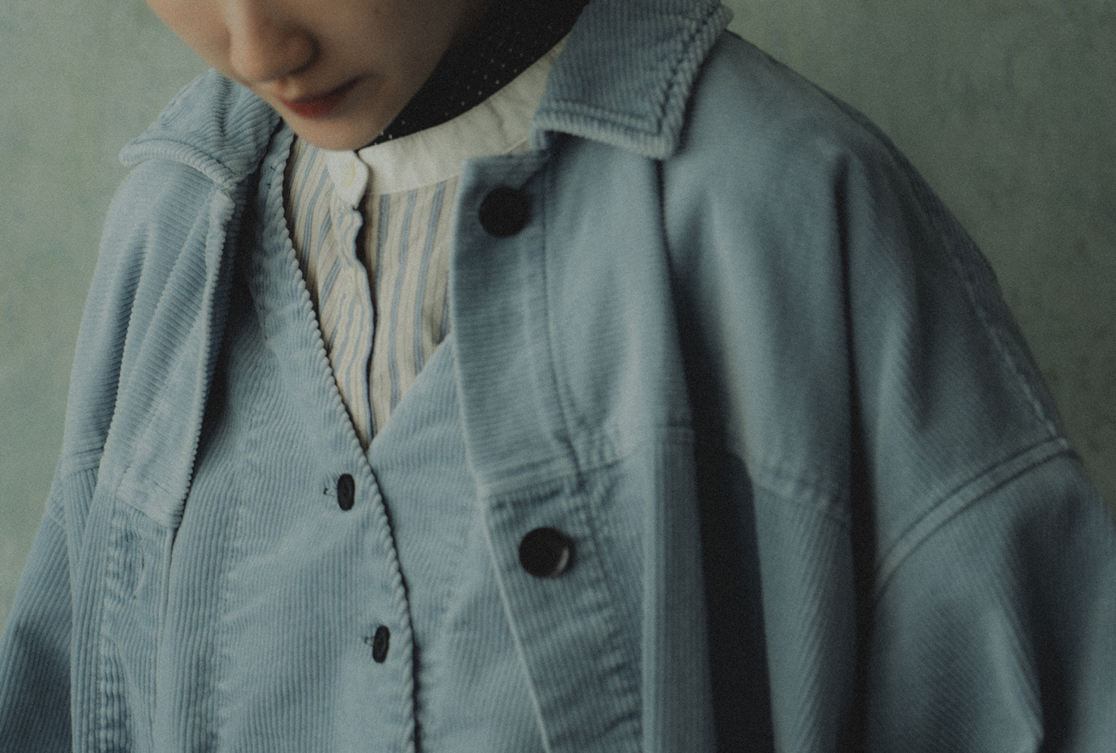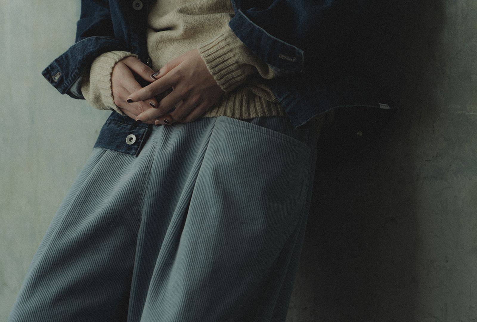 今季のnest Robeのコーデュロイは、豊かな表情をさらに引き出すため、生地の段階での染めや、製品に仕立てた後に行う後加工など、複数の工程を丁寧に重ねています。幾重の手仕事が、素材のもつ豊かさを際立たせています。