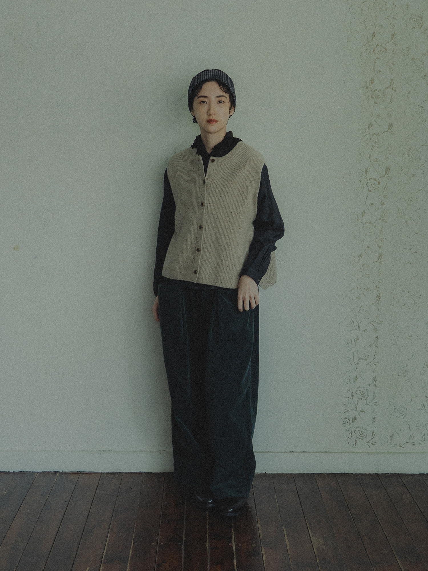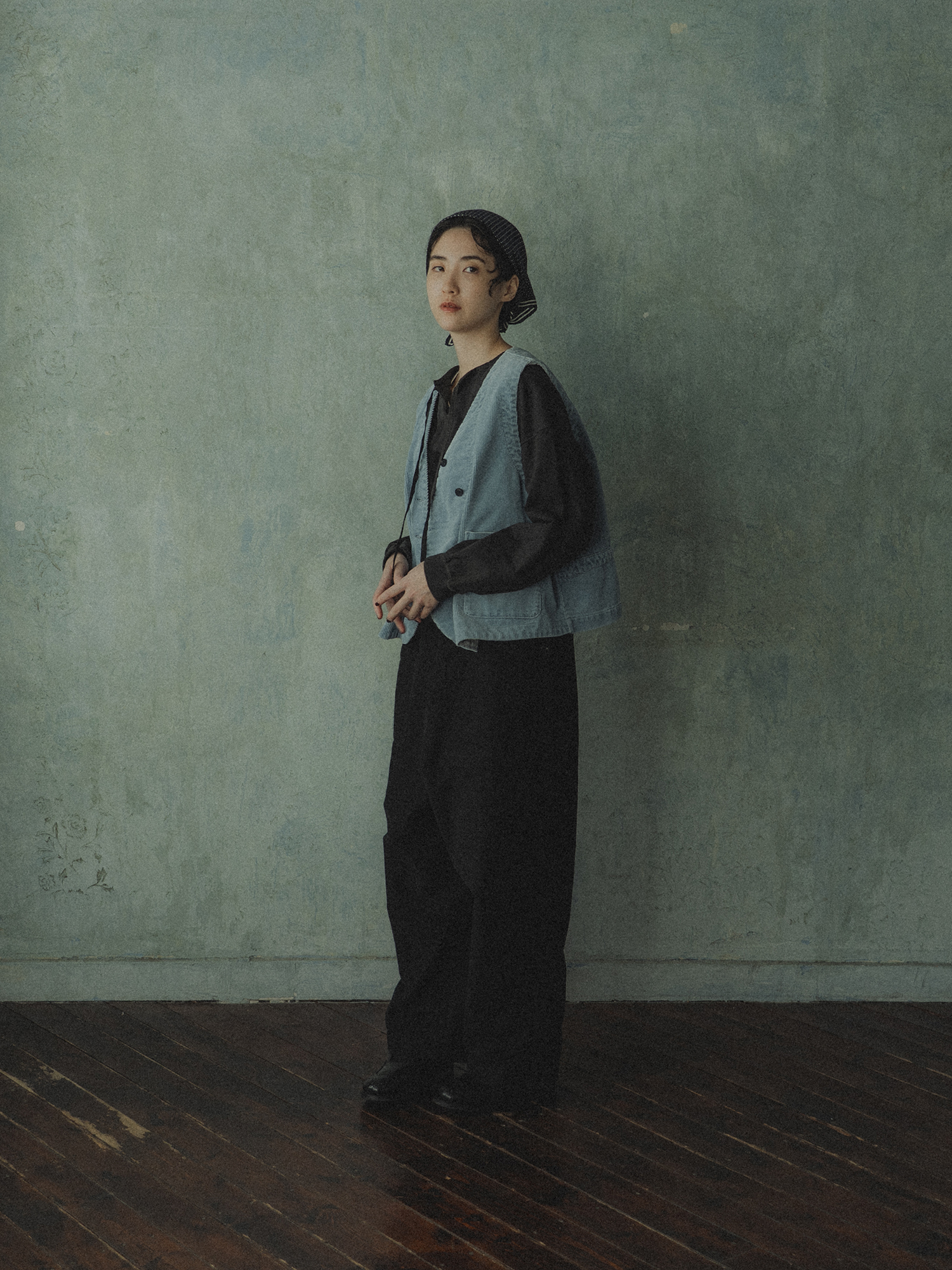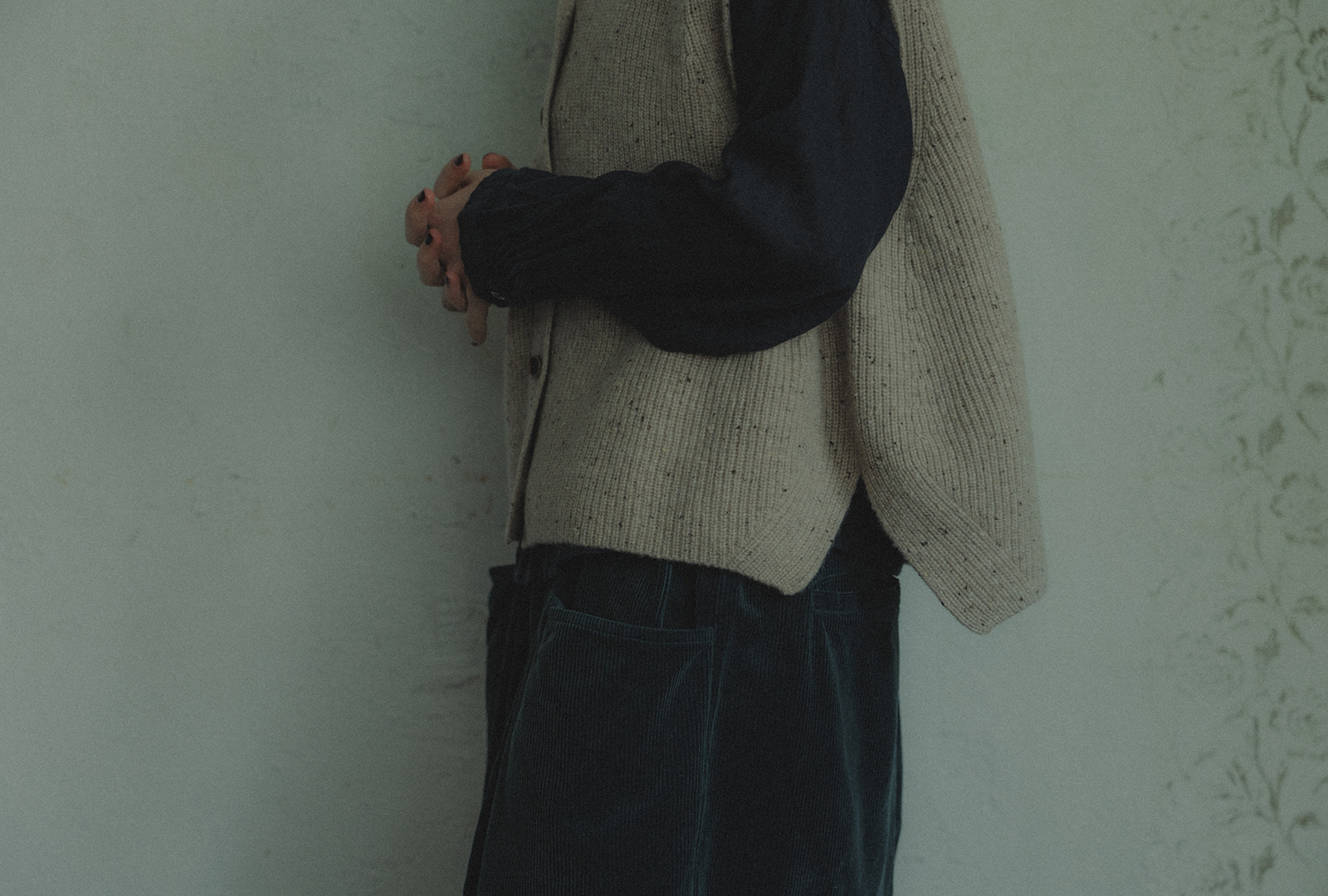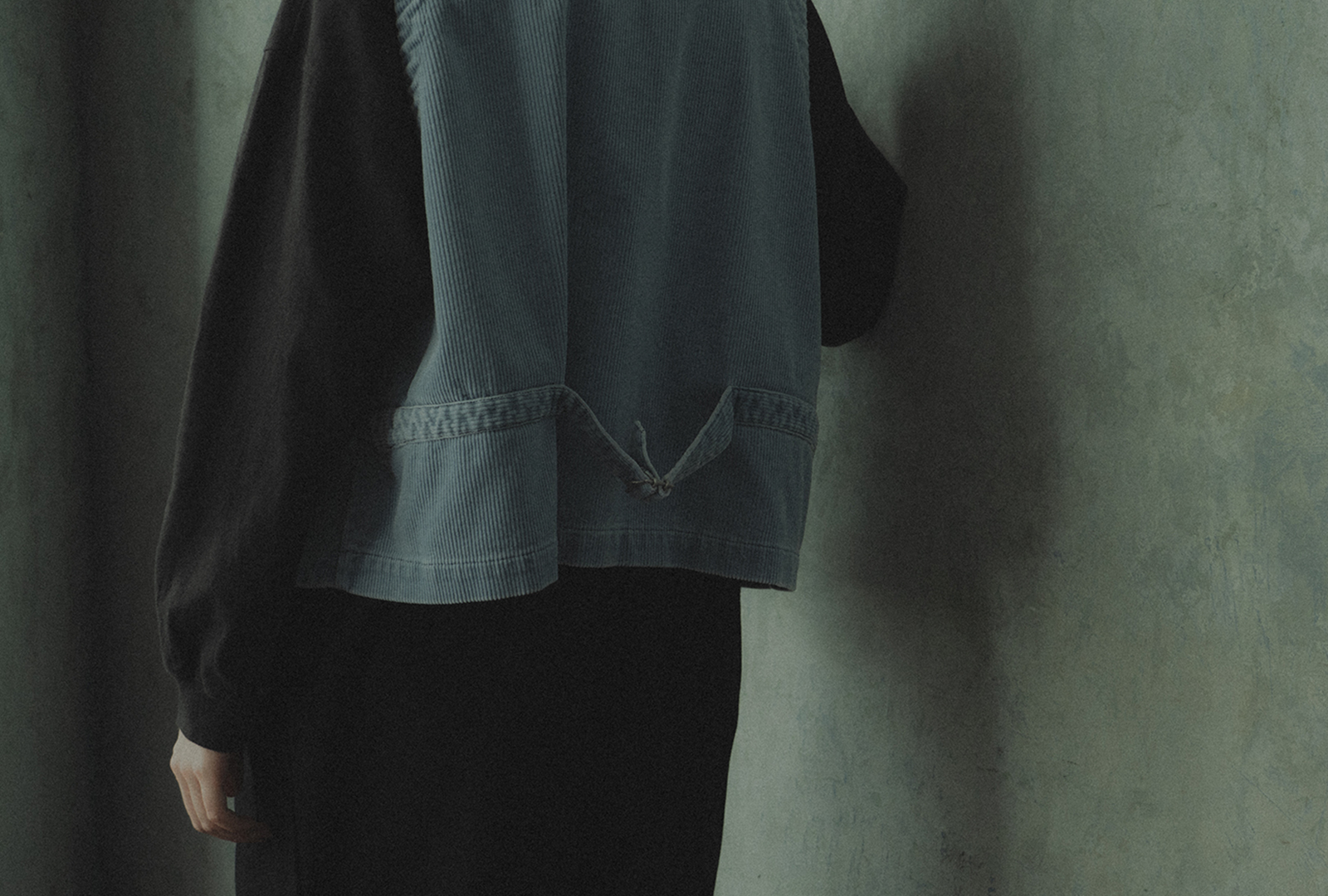 今季、nest Robeのコーデュロイは、コート、ベスト、ボトムスの3型を展開します。加工の有無によって生まれた異なる表情が、それぞれのアイテムにさりげなく息づきます。素材の持ち味を最大限に引き出すために、職人の丁寧な手仕事を惜しみなく注いで仕上げました。染め、仕上げ加工を依頼したのは、確かな経験値と熟練の技を持つ、岡山県倉敷市の染色・加工工場。丁寧な仕事が、素材本来の持ち味を一層引き立てます。