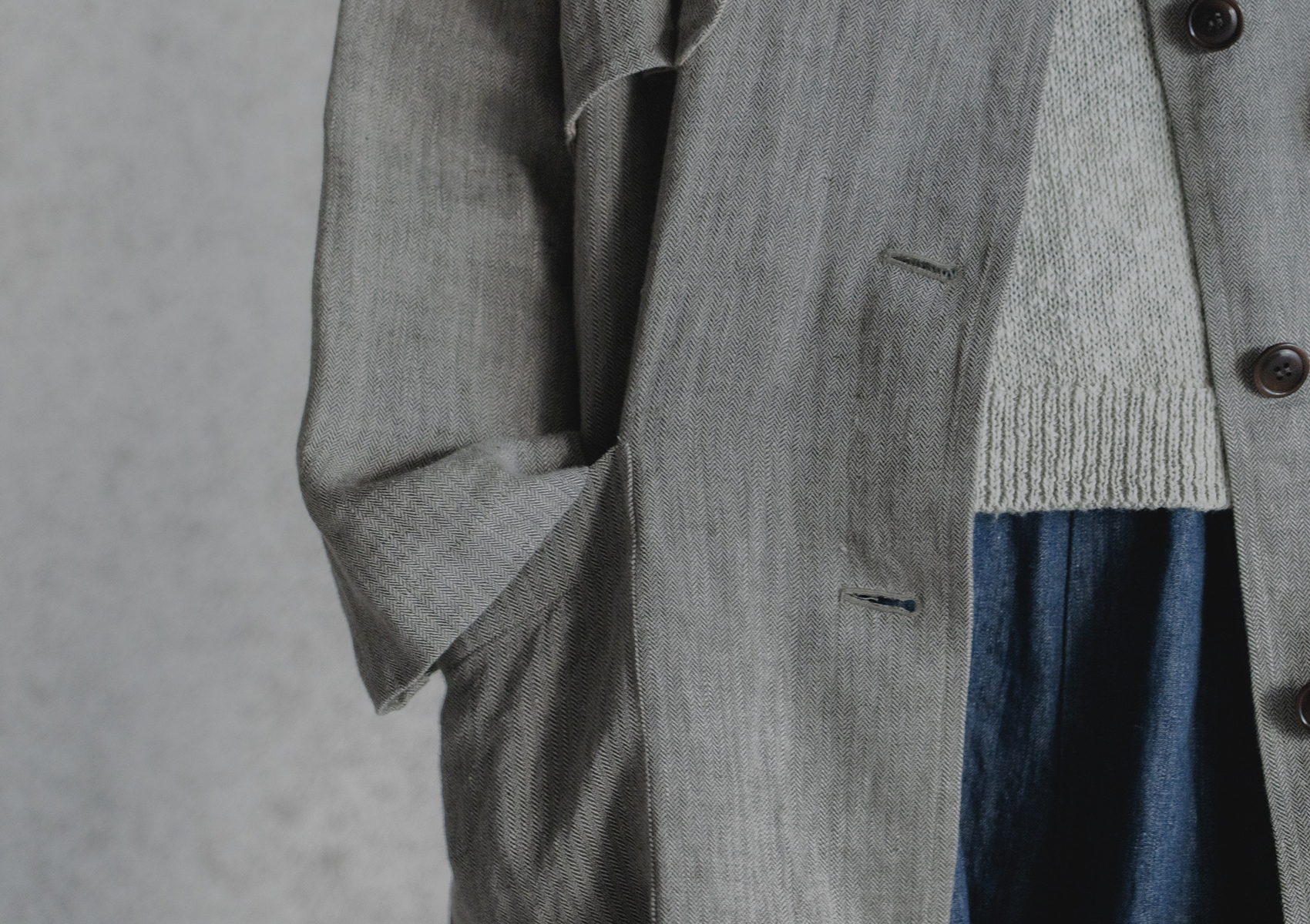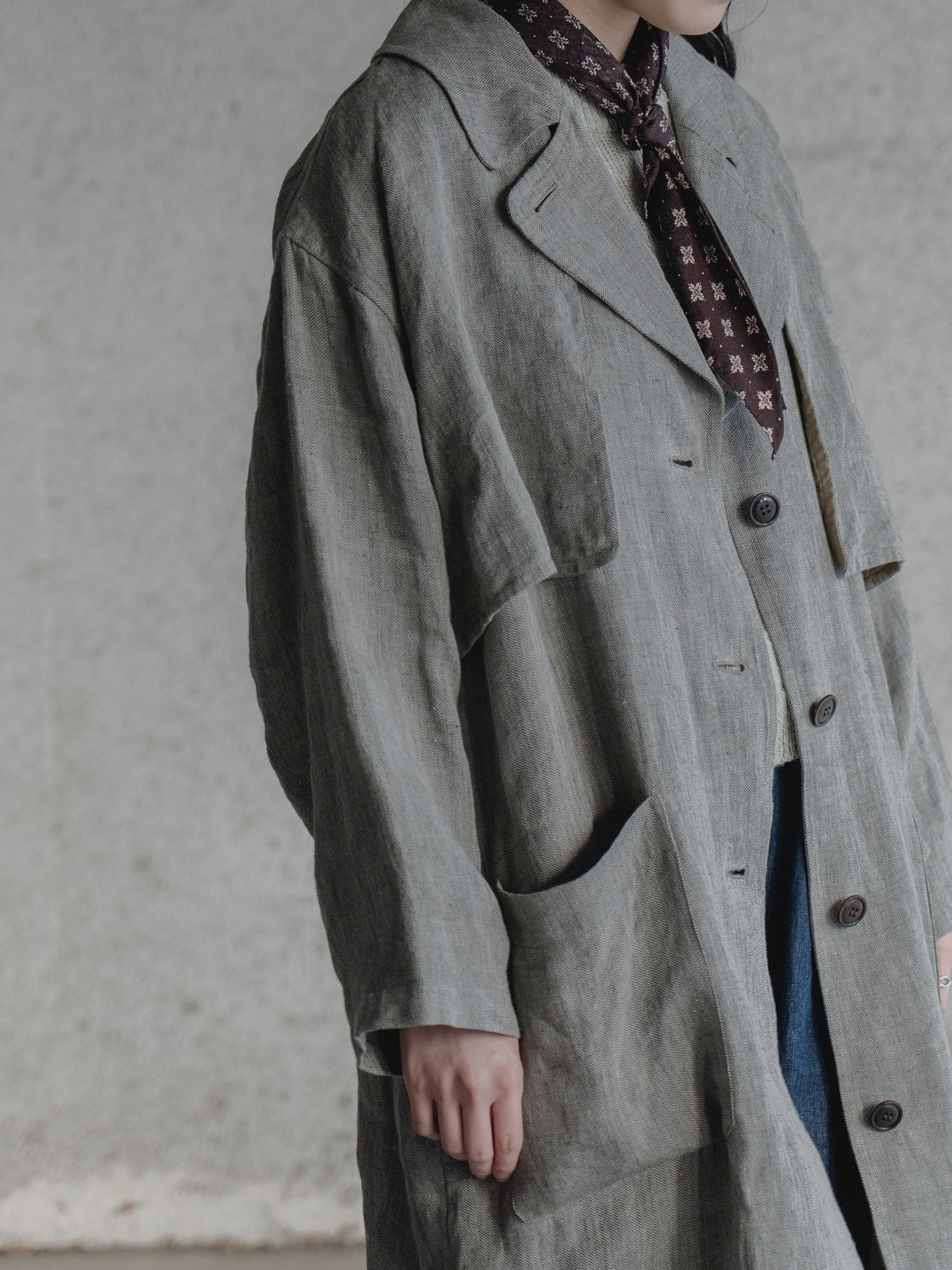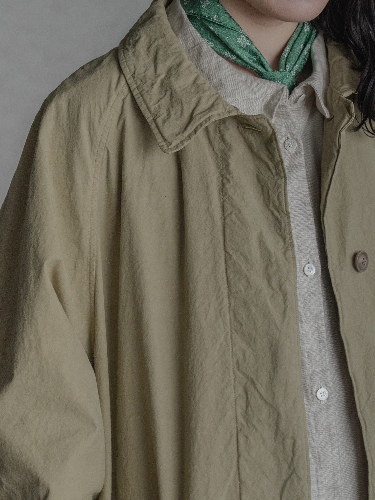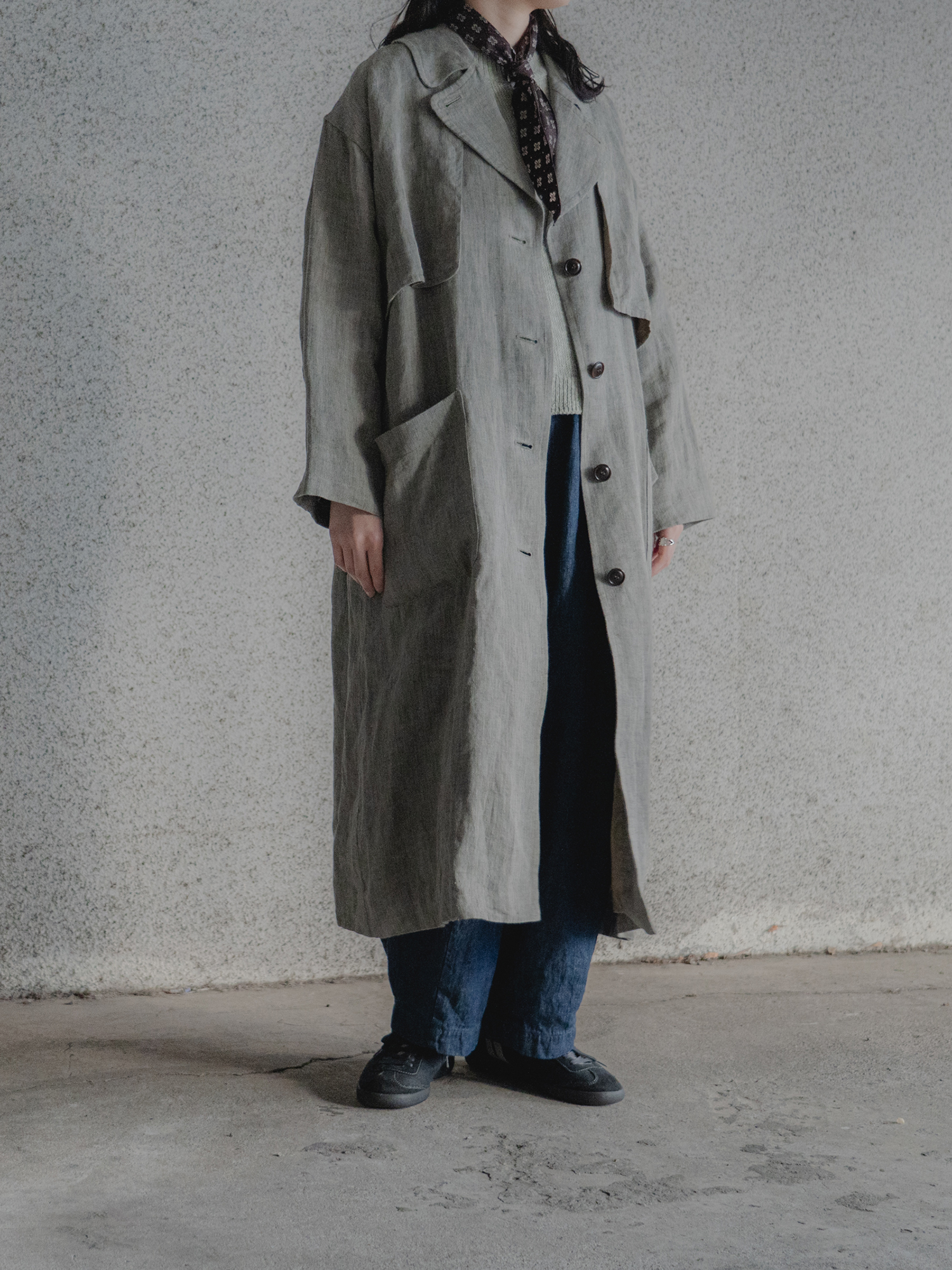 トレンチコートをリファレンスに、vintageの風合いをもつ麻100%で春に軽やかに羽織れる一着を企画しました。軽さと、麻ならではの自然なやわらかさ。その両方を感じられる仕上がりに。 理想の風合いを引き出すために、生地だけでなく製品後の工程にも丁寧に向き合いました。縫製後、つけ洗いを施し、天日でゆっくりと乾燥。その後、やわらかくスチームで整えた空気を含んだような自然な表情。 着はじめから身体になじむ一着に仕上げました。
