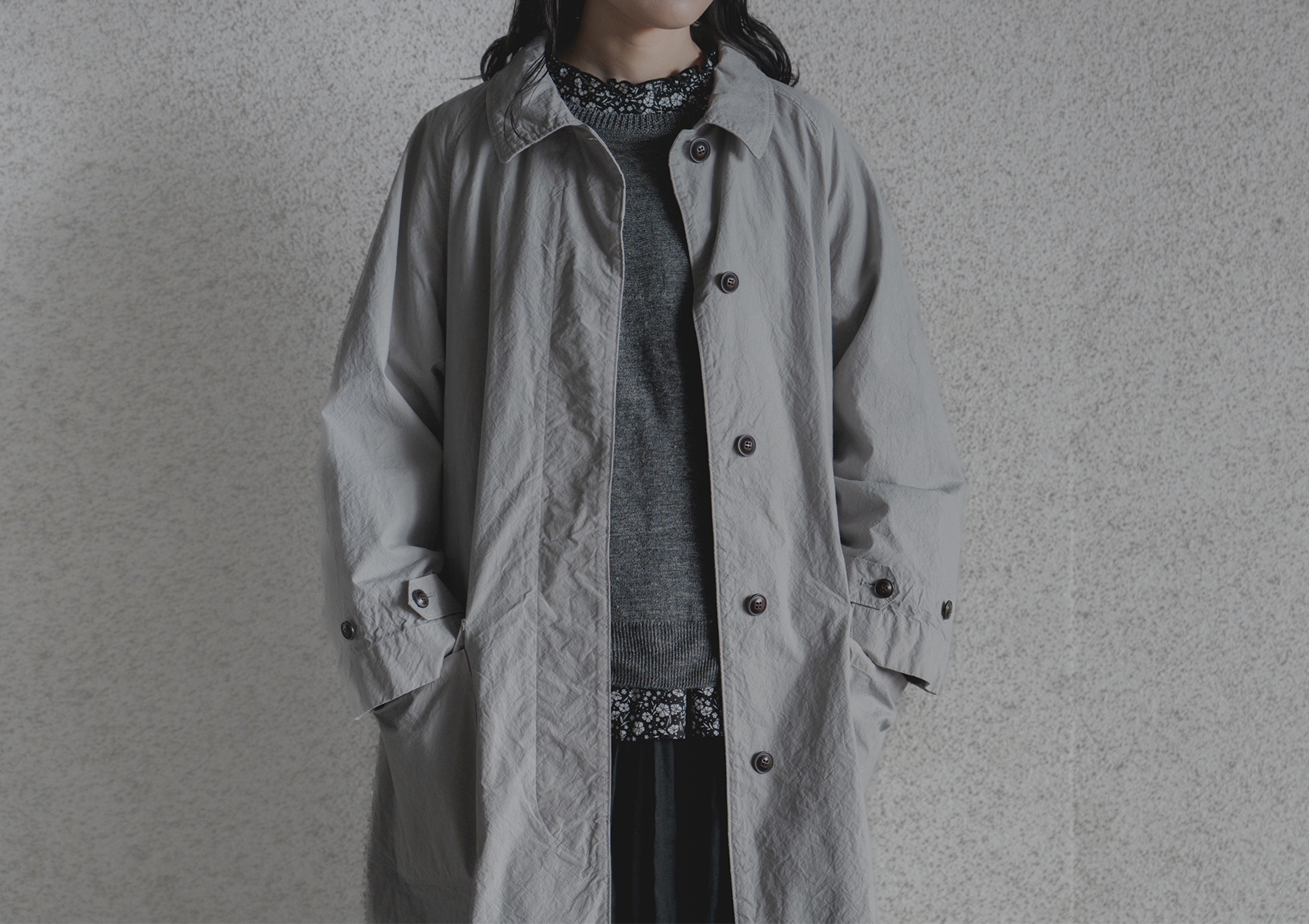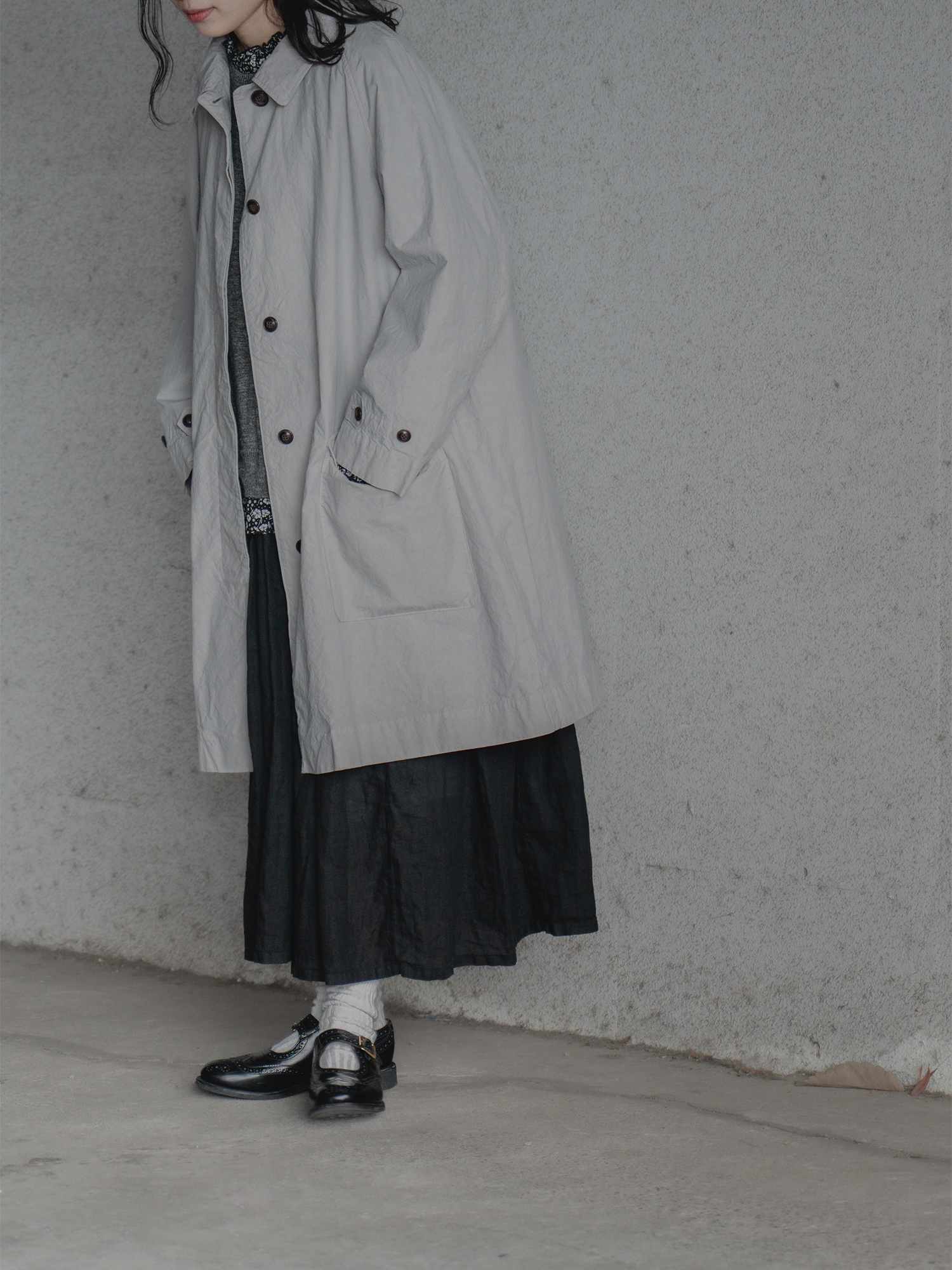 遠くに霞む街の木々を思わせる、スモーキーなイエローグリーン。曇りがかった空のような、やわらかなグレー。 イギリスヴィンテージを主軸とするブランドの背景に寄り添い、時代を超えて受け継がれてきたオーセンティックなステンカラーコートを、現代的なニュアンスを加え再構築しました。 製品染めを施すことで、生地にふくらみと洗いざらしたような表情を与え、奥行きのある豊かな風合いを表現しています。 ポケットにはパッチポケットにフラップを組み合わせ、タックを省いたミニマルな設計に。 春の空気に自然と馴染む、軽やかな表情に仕上げました。