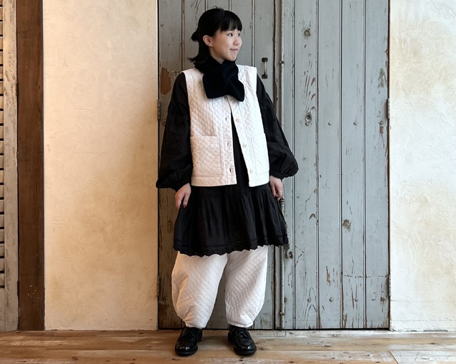 やわらかなオフホワイトのキルティングベストとパンツをセットで。