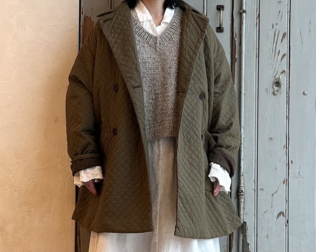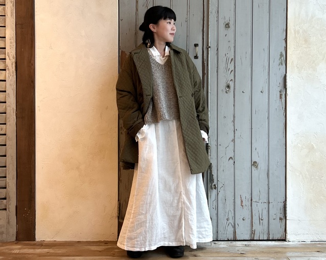 仕上げにキルティングコートを羽織って、軽やかで包み込まれるようなスタイルに。