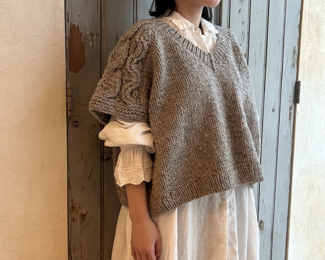 肩に施されたケーブル編みがさりげなく表情を添え、ナチュラルな風合いが魅力です。