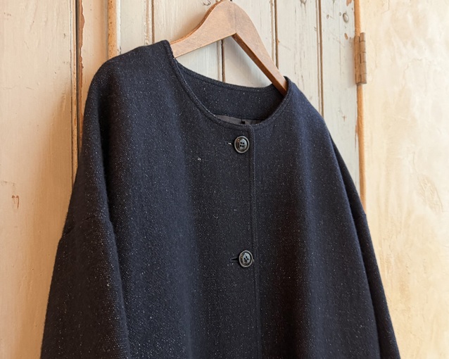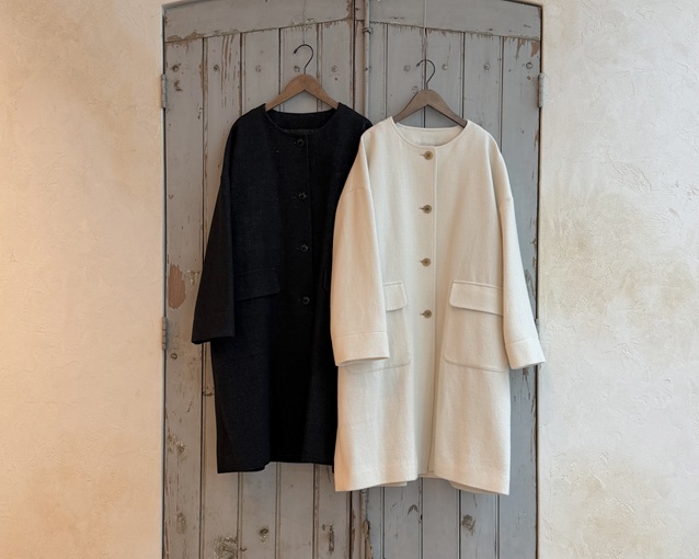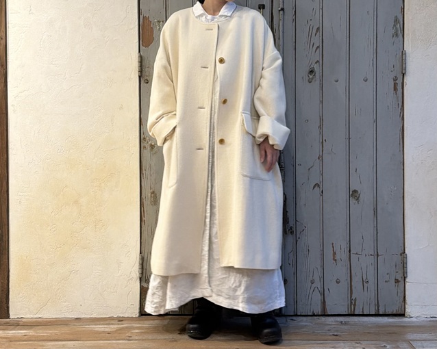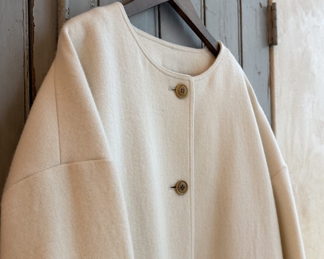 ゆったりとしたシルエットのノーカラーコート。