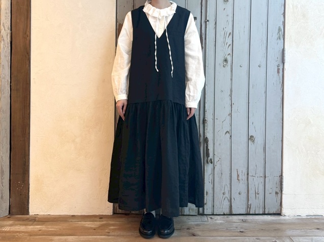 ワンピースのすっきりとしたVラインから、衿元のフリルがさりげなく覗き、