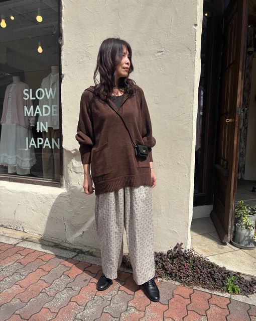 リネンでざっくり編み上げたダークブラウンのニットパーカーを合わせてみました。
