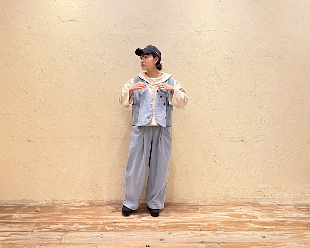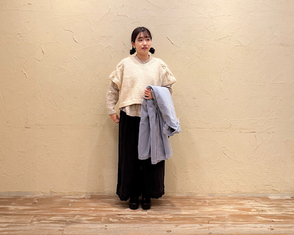 ベストの中に着用しているプルオーバーはご紹介したCREAM以外にもL・BLUEのお色がございます。