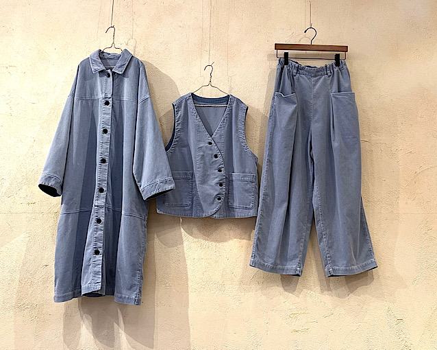 綿100%のコーデュロイ生地を使用していて、ピグメントダイ加工を施しています。