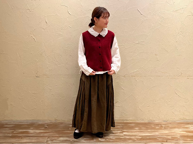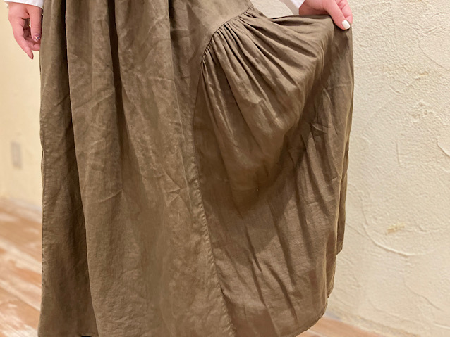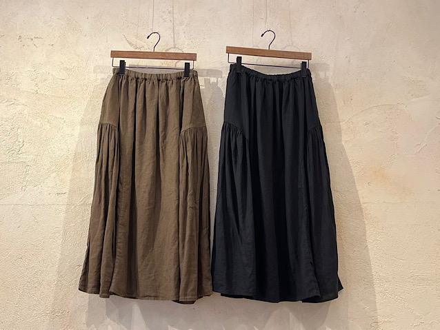 スカートは前回発売時にご好評頂いたリネンサイドギャザースカートの生地を秋冬仕様に