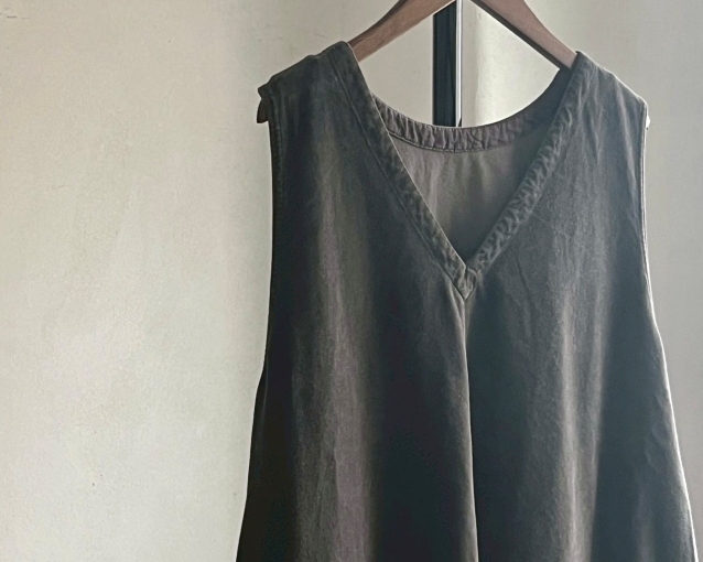 ワンピースはシンプルなデザインでありながら、ダブルステッチから生まれる凹凸が立体的な面持ち。