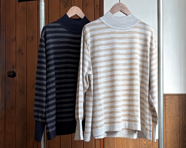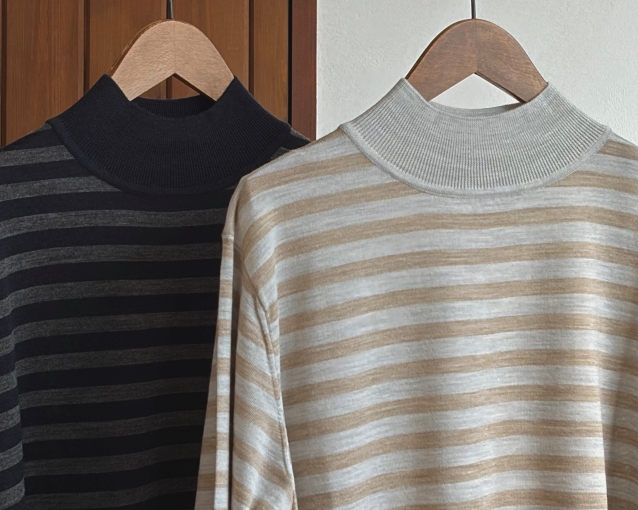 14Gハイネックボーダープルオーバー (D・NAVY / TOP・GREY) ¥27,500(税込) / nest Robe