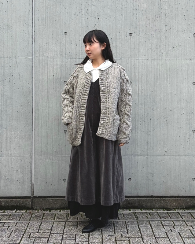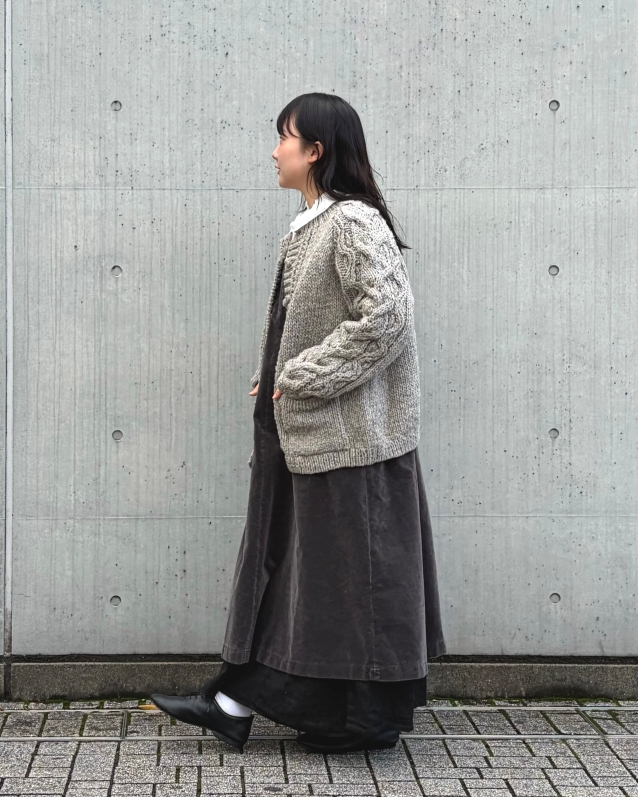 ハンドニットのペルーウールカーディガンの組み合わせは