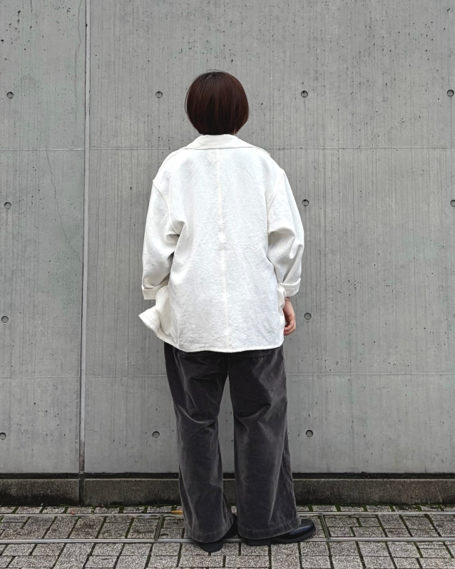 オーバーサイズのヘンプジャケットは、秋冬らしい厚みのある一枚。
