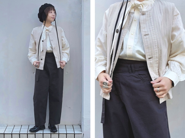 フリル襟にベストを重ねたエレガントなスタイルです。
