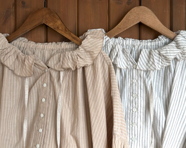 衿元のフリルとギャザーで軽やかな印象に。