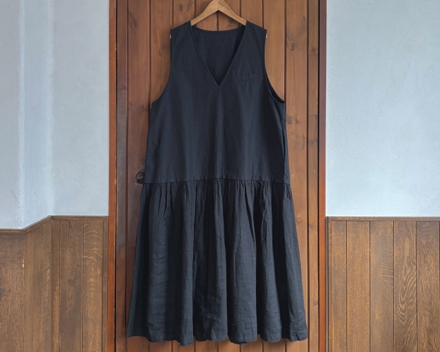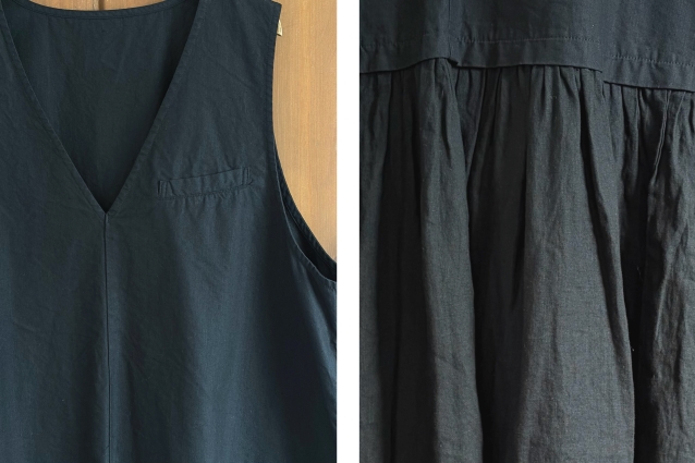 スカート部分にはたっぷりとギャザーを寄せたリネンを使い、