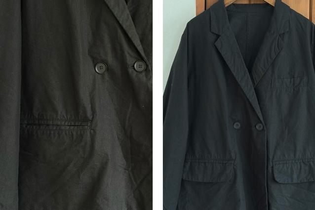 ジャケットの胸と両側のポケットはメンズライクなディテールを踏襲。