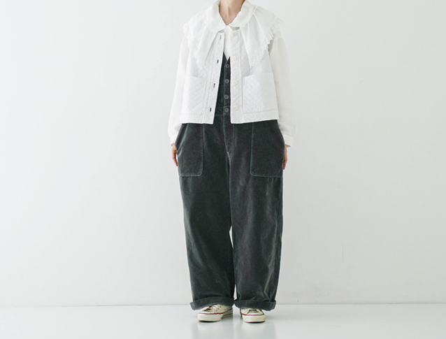 パンツやスカートスタイルにはもちろん合いますが、個人的にはサロペットやワンピースなど分量感のあるアイテムに"ちょこん"とあわせるのがおすすめです。