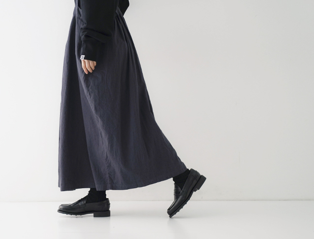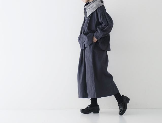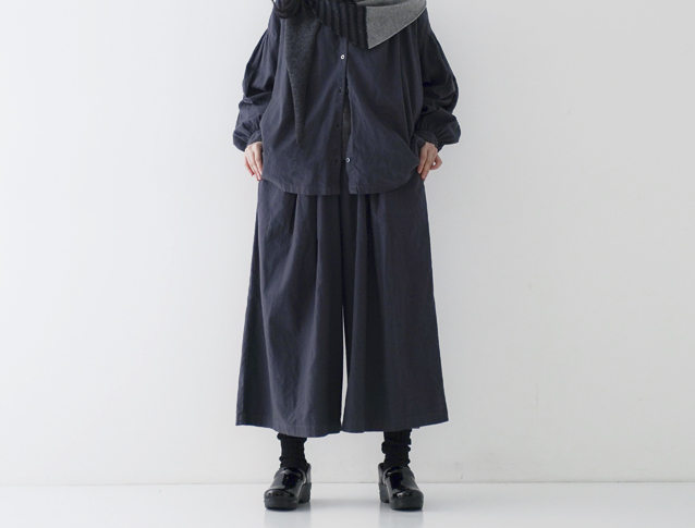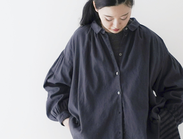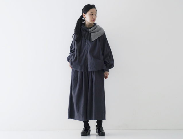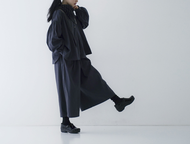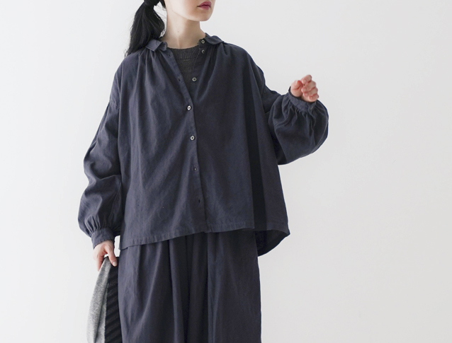 ダークトーンなのでギャザーの存在感がほどよく抑えらて甘くなりすぎず、使い勝手のいいアイテム。