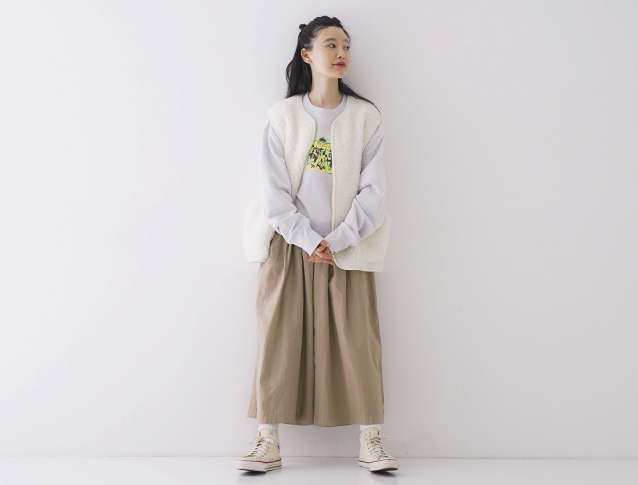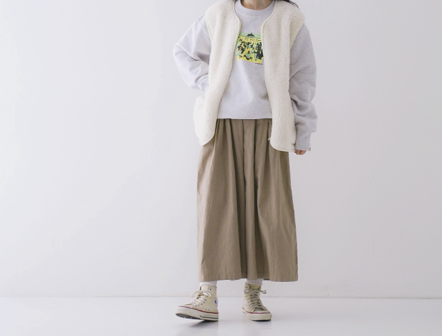 今回はスウェットにボアベストを合わせてカジュアルなまとめましたが