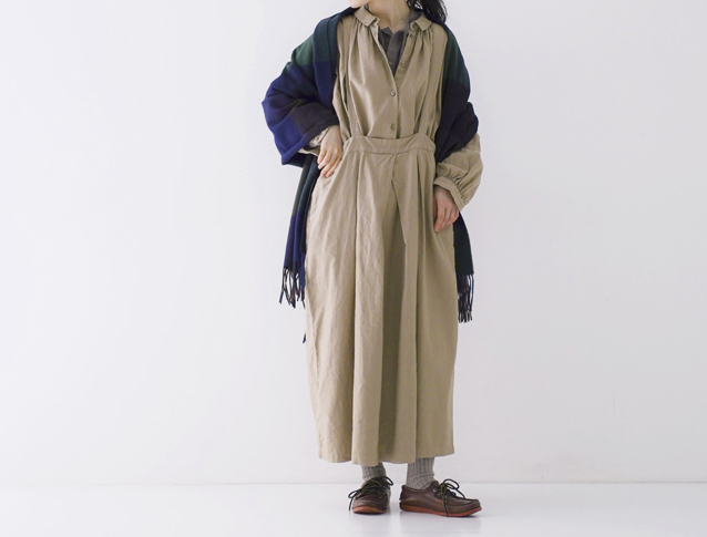 今回は吊りスカートのインにして、ワンピースのような見え方になるようにスタイリングしました。