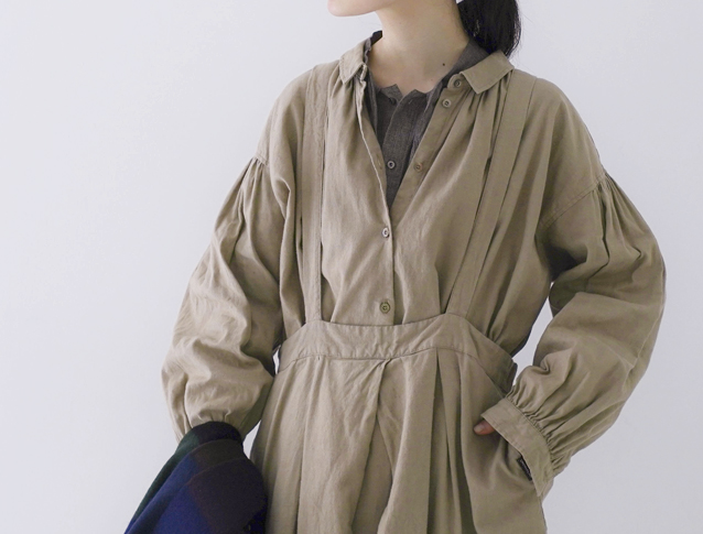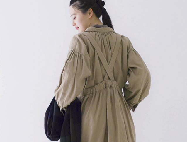 前回はブラウスとパンツを合わせましたが、今回はブラウスと吊りスカートのセットアップをご提案。