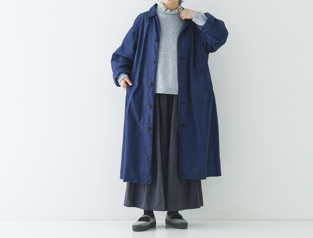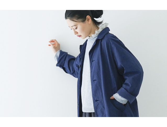 ライトブルーのニットにほどよく鮮やかなブルーのスーピマコットンのコートをプラス。