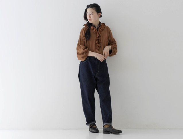 落ち着いたトーンでまとめた、大人のフリルスタイル。