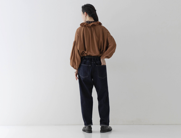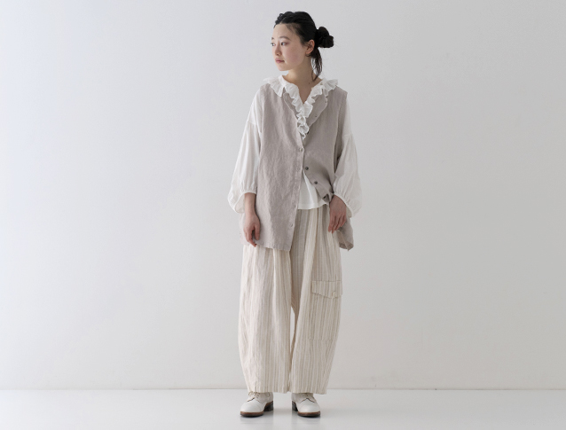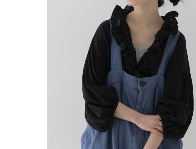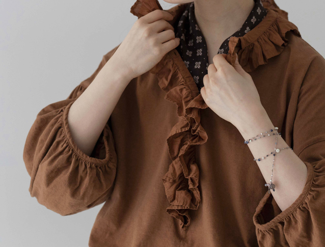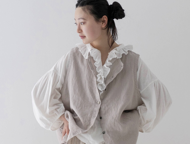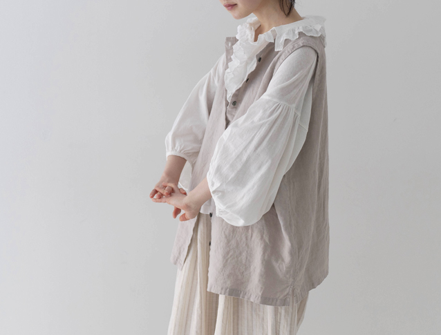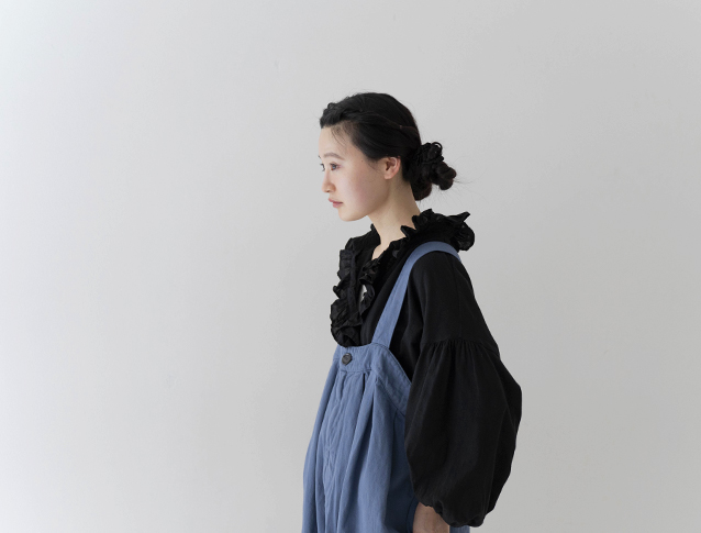 特徴的な襟には薄手の綿ローンを使用しており、キメが細かく適度な透け感がフリル部分をふんわり見せてくれてくれます。