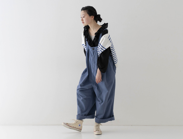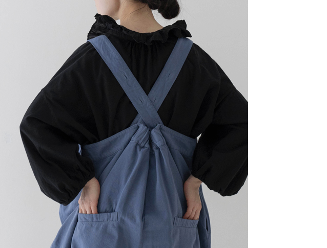 サロペットの肩紐は、クロス付けで丸みのあるシルエットにしてかわいくアレンジもアリです。