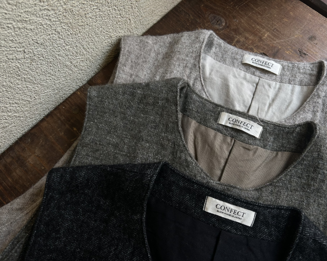 ウールリネン クルーネックベスト (OATMEAL / OLIVE / BLACK) ¥35,200(税込) / CONFECT