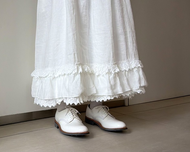 裾のレースがさりげない華やぎを添え、