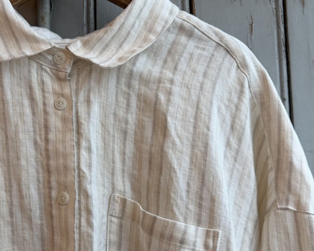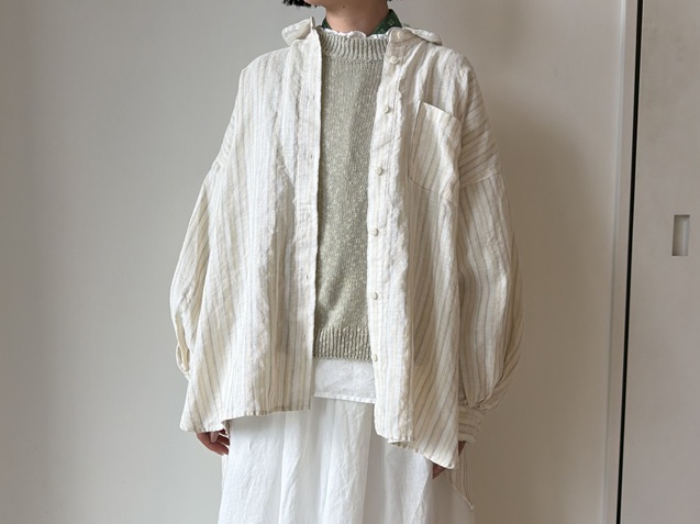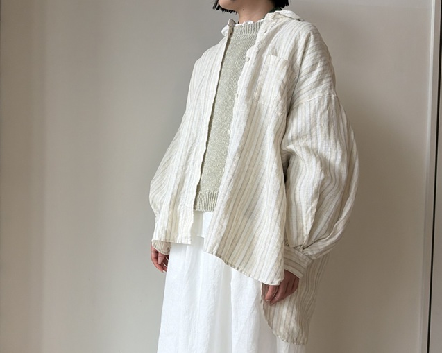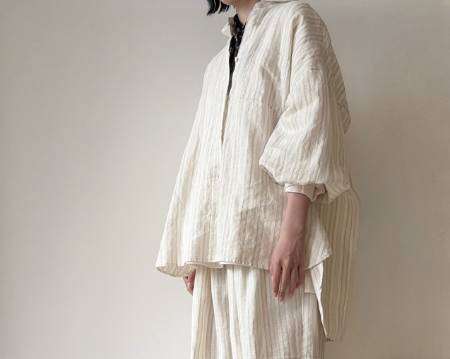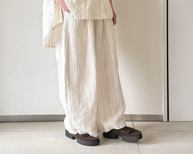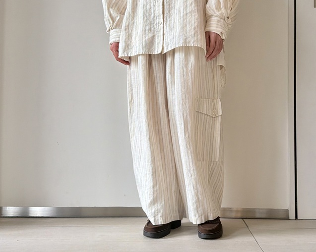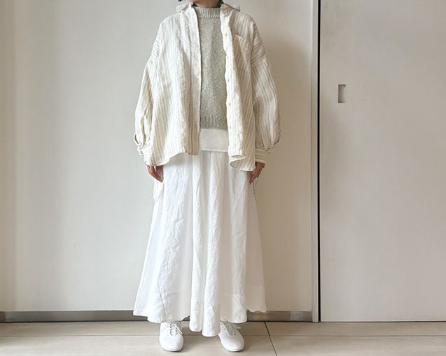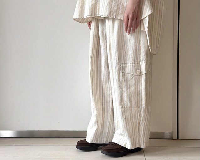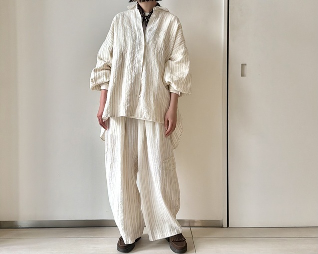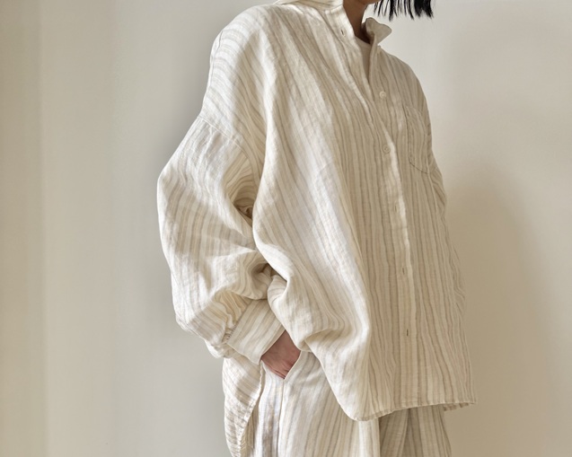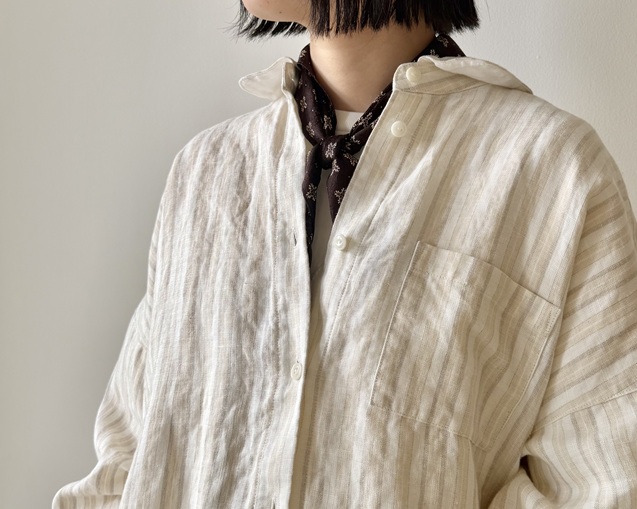リネンの風合いが引き立つストライプシャツのスタイリングから。