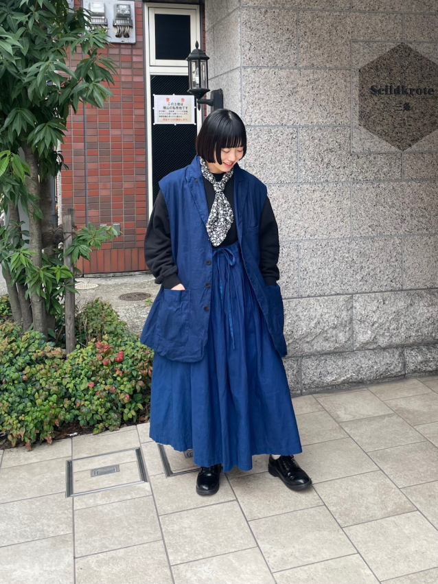 同じ藍染め素材でも表情が異なるのでセットでのコーディネートも楽しんでいただけます。