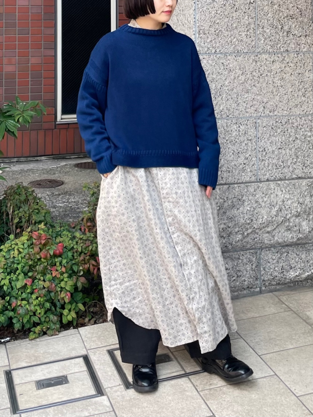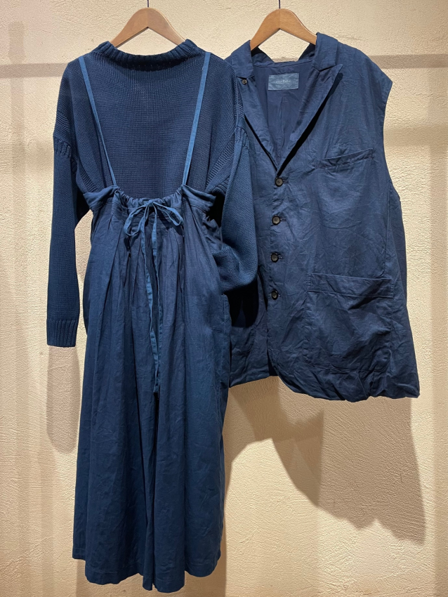 ジレやスカートに比べて、ガンジーニットはより深みのある藍色に。