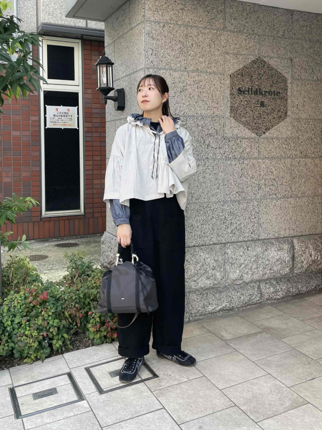 首元のフリルを活かしてボリューム感を出しつつ、足元はすっきりと。