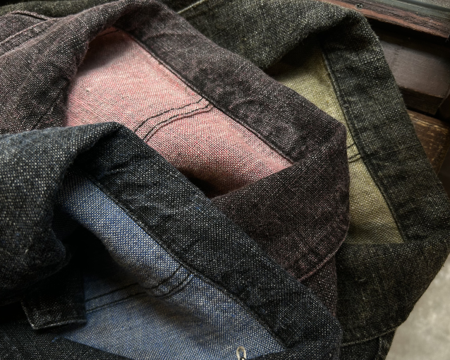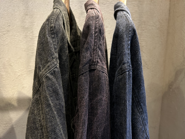 カラーリネン 墨コーティングシャツ (D.BLUE / D.KHAKI / D.PINK) ¥38,500(税込) / CONFECT